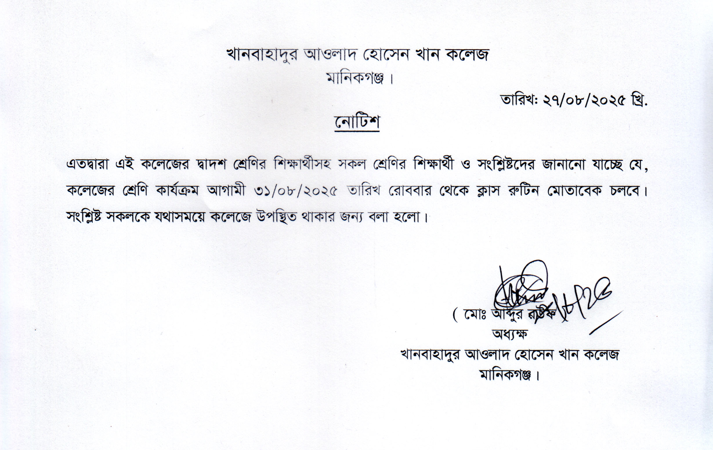 আগামী ৩১/০৮/২০২৫ তারিখ থেকে শ্রেণি কার্যক্রম শুরুর বিজ্ঞপ্তি, August 27, 2025