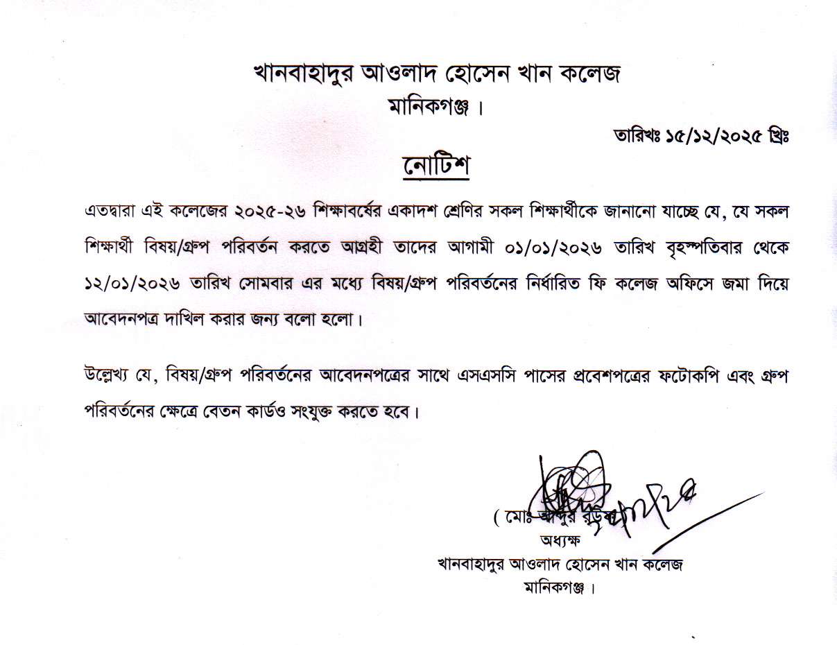 ২০২৫-২৬ শিক্ষাবর্ষে একাদশ শ্রেণিতে ভর্তিকৃত শিক্ষার্থীদের বিষয়/বিভাগ পরিবর্তনের নোটিশ, December 15, 2025