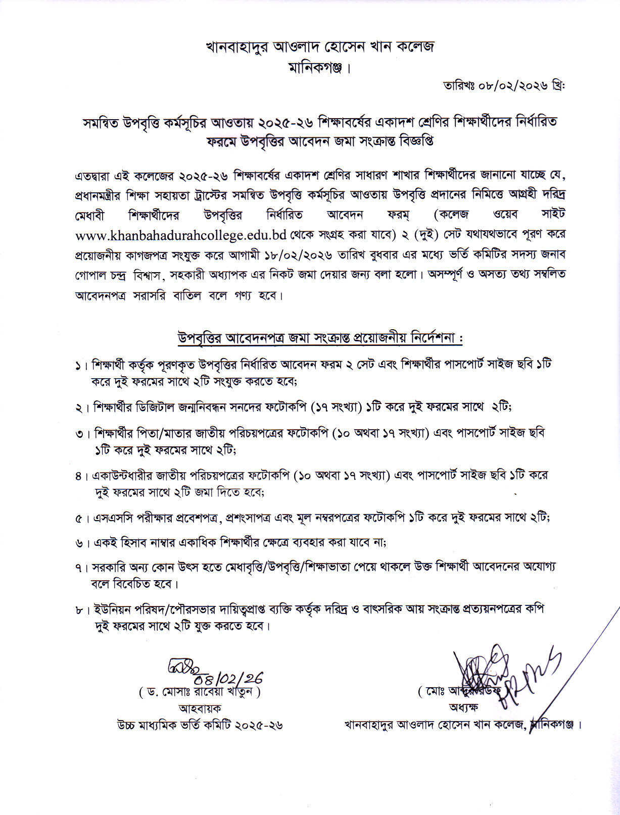 ২০২৫-২৬ শিক্ষাবর্ষের একাদশ শ্রেণির (সাধারণ শাখার) উপবৃত্তির আবেদন জমা প্রসঙ্গে, February 08, 2026